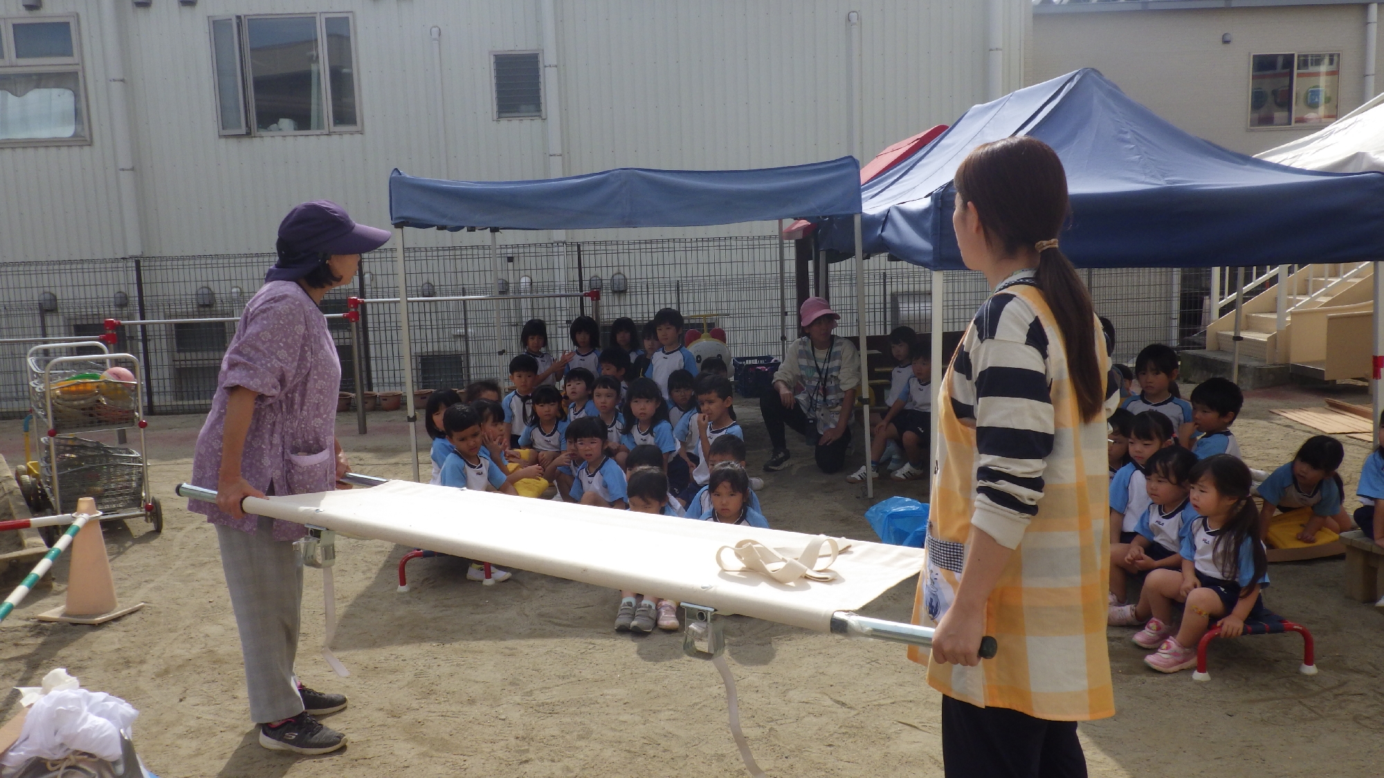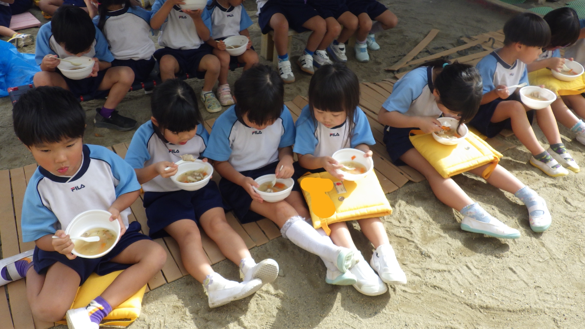 園庭にてアルファ米などの非常食をテントで食べる炊き出し体験もし、